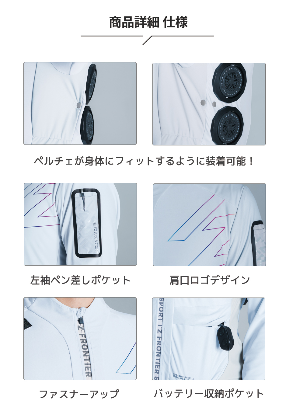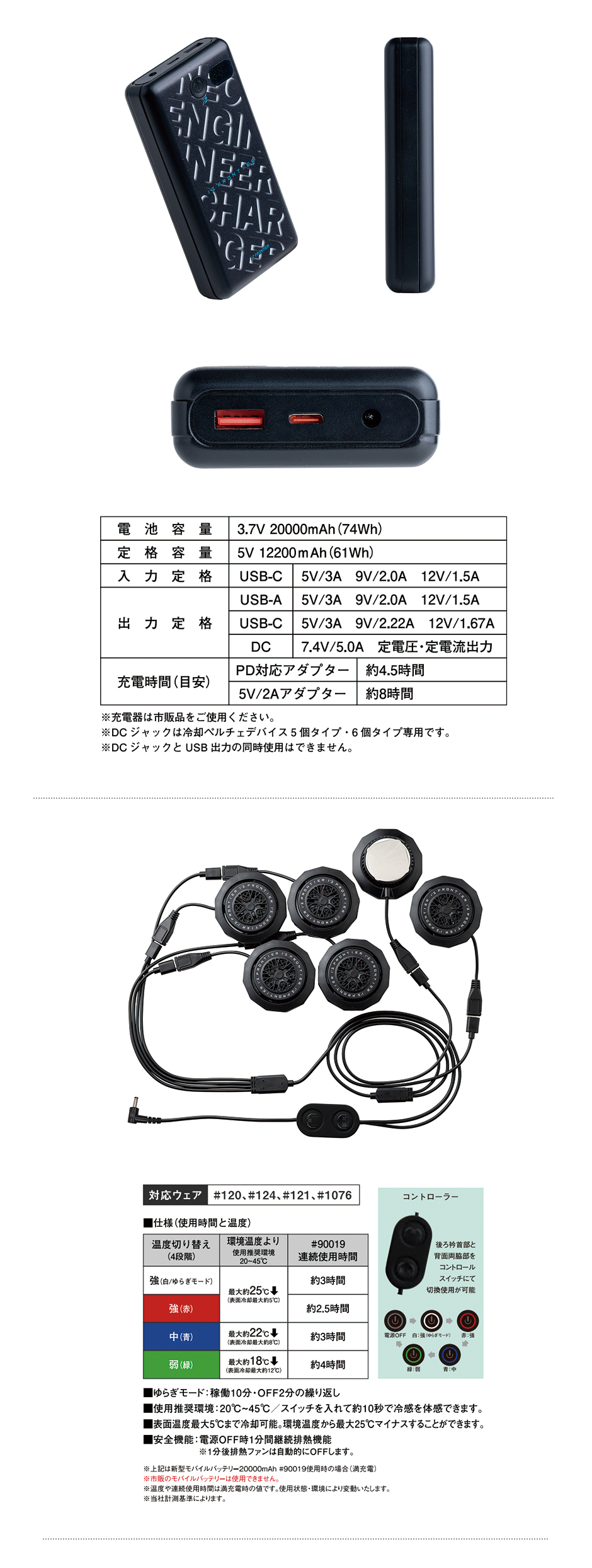 | ■後ろ衿首と背面両脇の計6ヶ所に直径5cmのペルチェデバイスが装着可能。デバイス接触部位は電源を入れ約10秒で環境温度より最大マイナス約25℃のハイレベルな冷却機能を発揮。動脈を冷やす事により効果的に身体全体をクールダウンさせ、猛暑時の疲労軽減を促します。 ■計6ヶ所配置されたペルチェデバイスは、後ろ衿首部と背面両脇部をそれぞれのコントロールスイッチにて切換使用が可能。 ■衣服素材もナノレベルまで砕いた特殊なマイクロメタルを生地原料に配合する事で、一般基準約2倍強の超ハイレベルな接触冷感機能を発揮。 ■糸性能のみならず素材その物にも冷感キシリトール加工を施し、Q-max値約0.41を実現した脅威の冷感パフォーマンス。 ■マイクロメタル効果により遮断率99.9%を誇るハイレベルなUVカット機能と快適性を増す抗菌性を両立。 ■素材構造によるモイスチャータッチの素材感と、伸長率タテ約30%・ヨコ約70%、伸長回復率約94%を誇るハイレベルなストレッチ性能を両立。 ■異形断面糸を使用し快適な吸水速乾性能と高貴なルックスを両立。更に糸と素材構造の特性により着用時の気になるシワを軽減。高い抗退色性能も。 ■着心地のみならず、素材構造特有の高い耐摩耗性能も有しています。 ■脇部分には胴囲マイナス4cmのアジャスターボタンを搭載し、よりフィット感を高めます。 ■ウェアの上からフルハーネス装着可能。 ■専用バッテリーポケット裏側には断熱材を採用し、バッテリーが発する熱を遮断します。 ペルチェデバイス ■デバイス接触部位は電源を入れ約10秒で環境温度より最大マイナス約25℃のハイレベルな冷却機能を発揮。 ■長時間使用による冷感麻痺を回避する為にゆらぎモード (稼働10分・オフ2分の繰り返し) を搭載。 ■デバイス取り付け用リングは特許取得のラッチ式を採用し、 簡単且つ強力に固定。 使用電源 #90019 20000mAhモバイルバッテリー専用DCジャック使用 温度切り替え 4段階 ◎仕様(使用時間と温度) 強(白/ゆらぎモード):最大冷却温度/約-25度 (表面冷却最大約5℃) 連続使用時間/3h 強(赤):最大冷却温度/約-25度 (表面冷却最大約5℃) 連続使用時間/2.5h 中(青):最大冷却温度/約-22度 (表面冷却最大約8℃) 連続使用時間/3h 弱(緑):最大冷却温度/約-18度 (表面冷却最大約12℃) 連続使用時間/4h ※環境温度比較 ■コントローラー付 後ろ襟首部と背面両脇部をコントロールスイッチにて切換使用が可能 ■ゆらぎモード:10分ON→2分OFFの繰り返し ■使用推奨環境:20℃~45℃/スイッチを入れて約10秒で冷感を体感できます ■表面温度最大5℃まで冷却可能。環境温度から最大25℃マイナスすることができます。 ■安全機能:電源OFF時1分間継続排熱機能 ※1分後排熱ファンは自動的にOFFします。 ※上記は新型モバイルバッテリー20000mAh#90019使用時の場合(満充電) ※市販のモバイルバッテリーは使用できません。 ※温度・連続使用時間は満充電時の値です。使用状態・環境により変動いたします。 ※メーカー計測基準によります ■セット内容 ジャケット×1 ペルチェクールデバイス×1/取扱説明書兼保証書×1 バッテリー(#90019)×1/充電用ケーブル(TypeA-TypeC)×1/取扱説明書×1 |