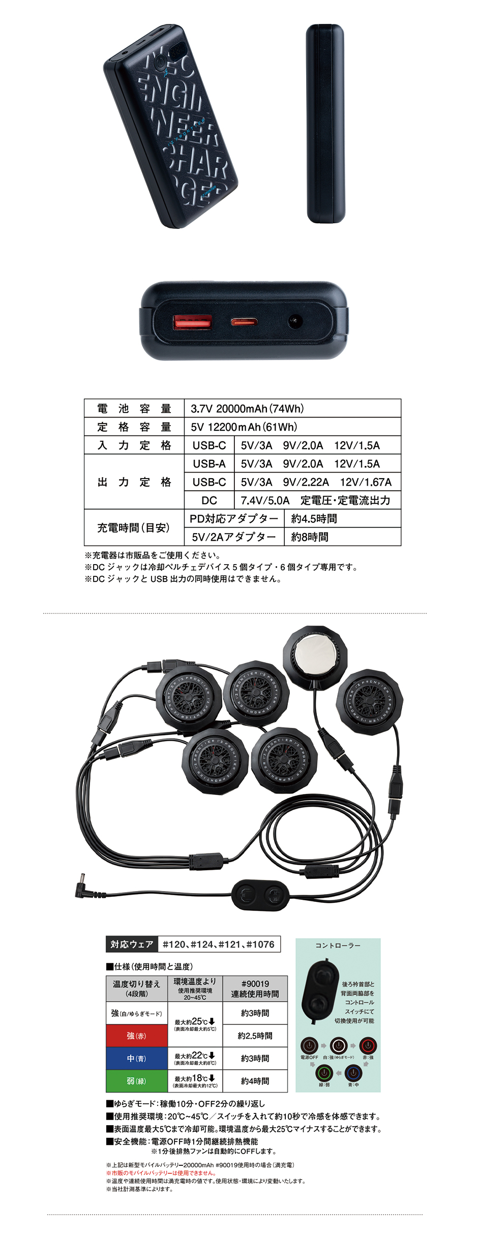 | ダブルスライダー止水ファスナー ■バッテリー仕様 寸法:H25.3×W68×L130mm(本体) 重量:約345g(バッテリー1個) 電池容量:3.7V 20000mAh(74Wh) 定格容量:5V 12200mAh(61Wh) 出力:5V/3A 9V/2.0A 12V/1.5A(USB-Aの場合) 5V/3A 9V/2.22A 12V/1.67A(USB-Cの場合) 7.4V/5.0A 定電圧・定電流出力(DCの場合) 入力:5V/3A 9V/2.0A 12V/1.5A(USB-Cの場合) 充電時間:約8時間(通常アダプター5V/2Aの場合) 約4.5時間(PD対応アダプターの場合) ※バッテリー充電器は付属しません。市販品をご使用ください。 ※DCジャックは冷却ペルチェデバイス5個タイプ・6個タイプ専用です。 ※DCジャックとUSB出力の同時使用はできません。 |