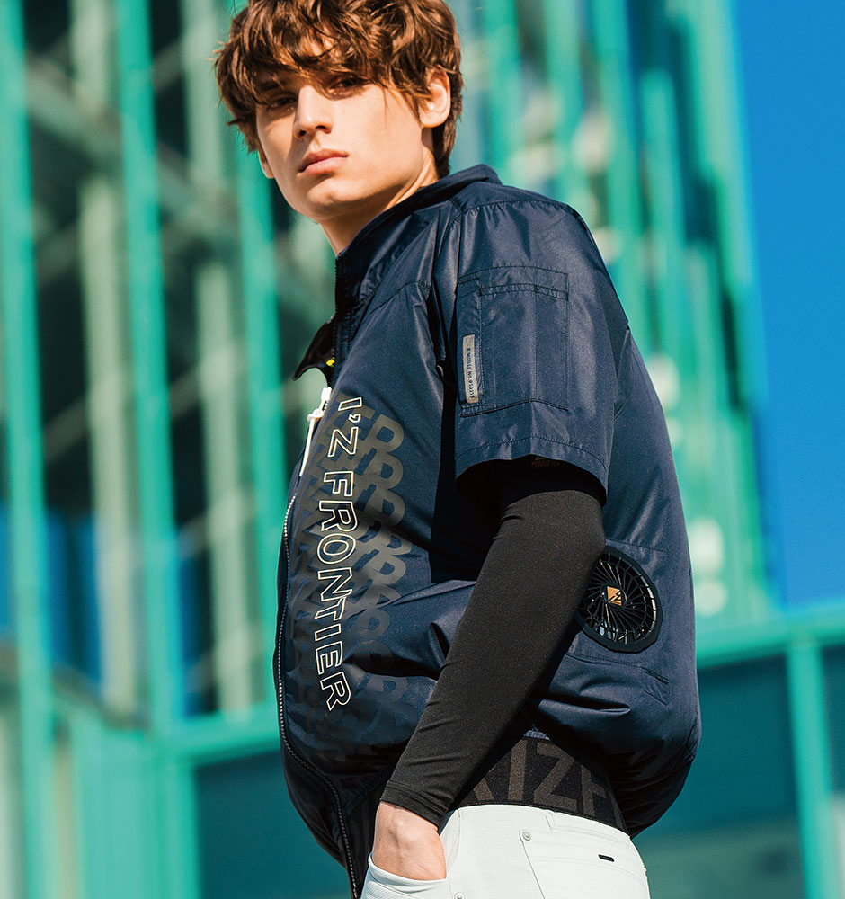 | 風抜けの良い立ち襟スタイル、首後ろの立体構造で衣服内を風が駆け巡る、首後ろの空気の流れを作る2重構造、背中に空気を冷やす保冷剤用ポケット、高い遮熱性とUVカット率で衣服内温度上昇を揮える裏アルミコーティング、小物が入る左袖ペンポケット、ハーネス用フック掛け、ファスナー付きハーネス取付口 |
