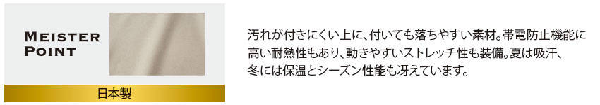 汚れが付きにくい上に、付いても落ちやすい素材。帯電防止機能に高く、耐熱性もあり、動きやすいストレッチ性も装備。夏は吸汗、冬には保温とシーズン性能も冴えています。