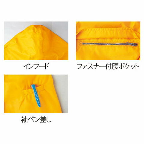 | インフード、ファスナー付腰ポケット、袖ペン差し |