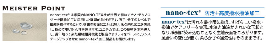 | ・防汚+高度撥水撥油加工、通気性・風合いの保持・耐久性に優れる |