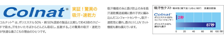 吸汗機能の糸と透け防止の糸を吸汗速乾構造組織に編み込んだコンフォートセンサー。吸汗・速乾性に優れ、透けにくく、UVカット機能も兼ね備えています。