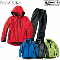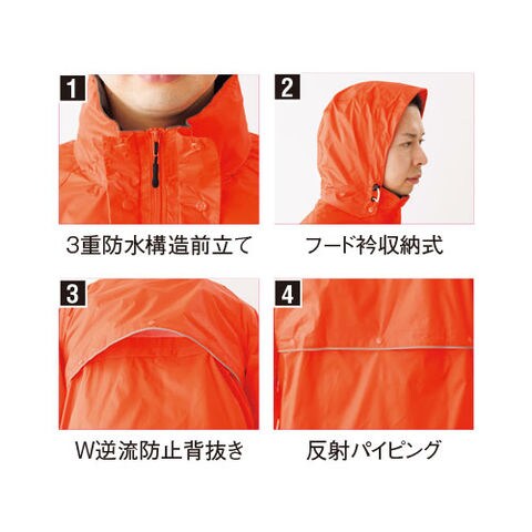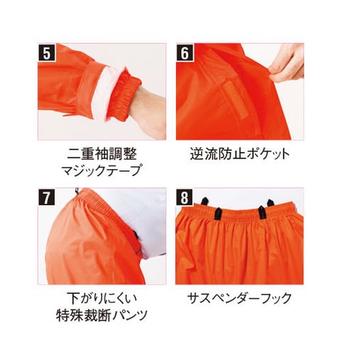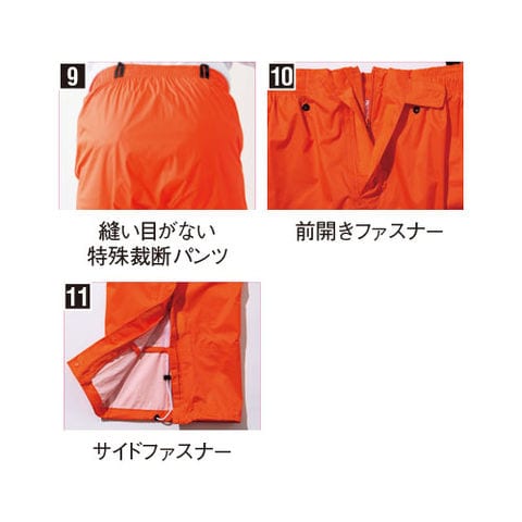 3重防水構造前立て、フード衿収納式、W逆流防止背抜き、反射パイピング、二重袖調整マジックテープ、逆流防止ポケット、下がりにくい特殊裁断パンツ、サスペンダーフック(サスペンダーは別売です)、縫い目がない特殊裁断パンツ、前開きファスナー、サイドファスナー