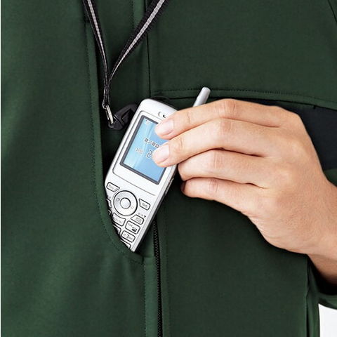 | ・携帯ポケット:携帯電話をスマートに収納できるポケットをフロントに付けました。深いポケットにスッポリ収まります。 ・袖ポケット:作業時に必需品のカッターナイフやマジックなどを入れるのにぴったり。すっきり入るセパレートタイプです。 ・切り込みつきポケットタブ:名札をすっきり付けたい。そんな希望に応えるポケットタブに切り込み付き。名札クリップをしっかりホールドします。 ・名札ループ:ピンでブルゾンを傷めることなく名札をキープできるループ付。吊り下げタイプの名札に最適です。 |