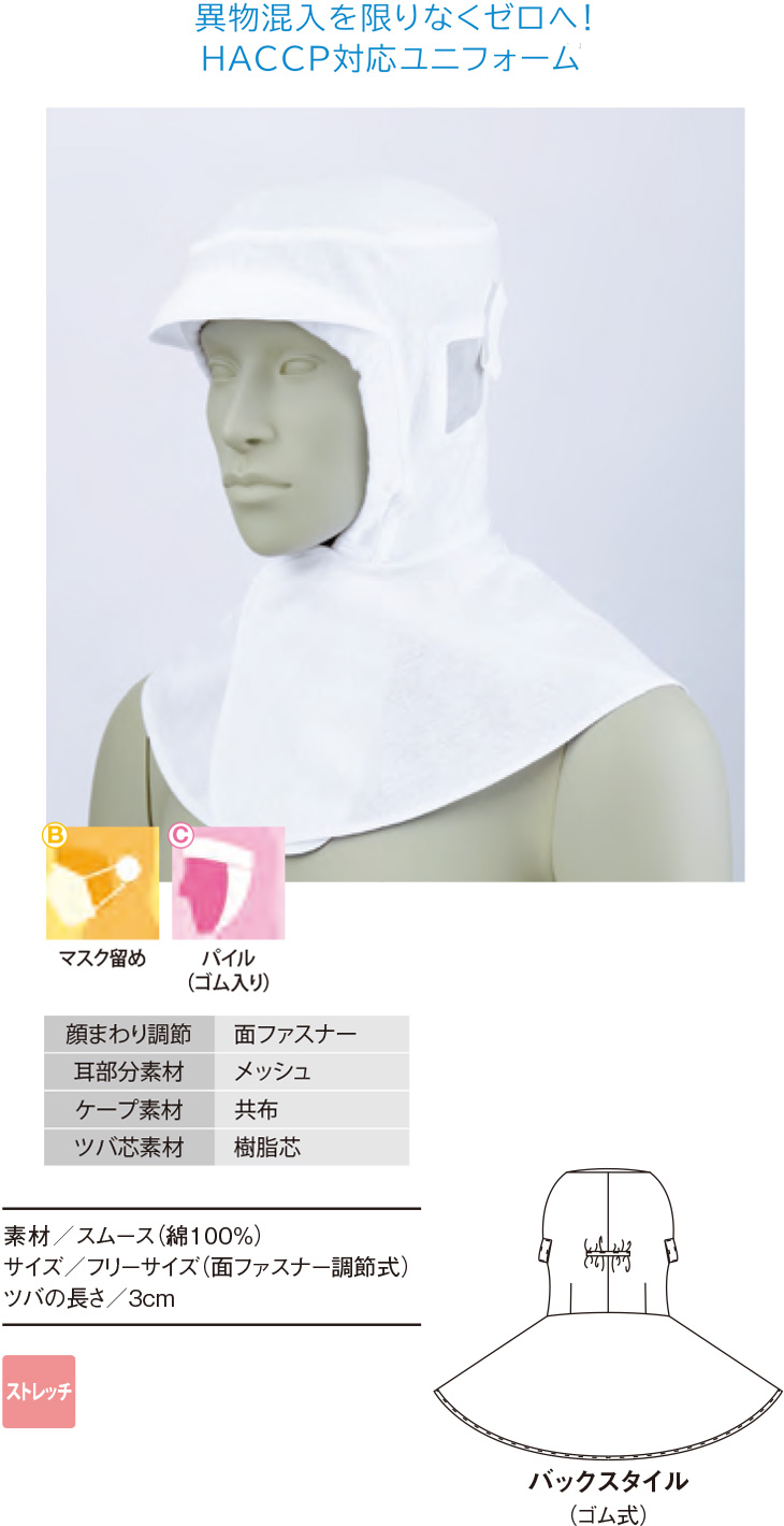 | マスク留め、パイル、耳メッシュ、ケープ、後部ゴム式 |