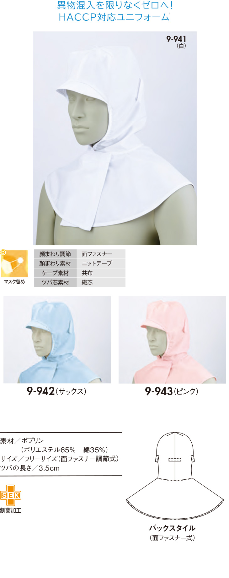 【メール便対応】 衛生帽子 ケープ付き 頭巾帽子 衛生帽 帽子 フード フード帽子 食品 白衣 衛生衣 男性 女性 メンズ レディース 住商モンブラン 9-941・942・943 食品工場 食品加工 厨房 調理 制服 ユニフォーム 毛髪 混入防止