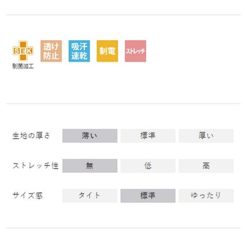 | 抗菌(O-157対応)、透け防止、吸汗速乾、制電、ストレッチ |