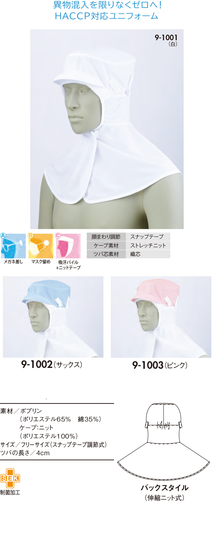 【メール便対応】 衛生帽子 ケープ付き 頭巾帽子 衛生帽 帽子 フード フード帽子 調節式 食品 白衣 衛生衣 男性 女性 メンズ レディース 大人 住商モンブラン 9-1001・1002・1003 食品工場 食品加工 厨房 調理 制服 ユニフォーム