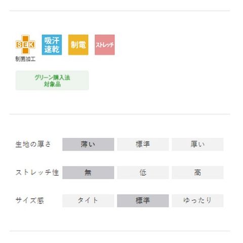 | 抗菌(O-157対応)、透け防止、吸汗速乾、制電 |