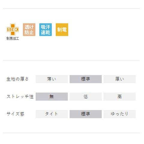 | 抗菌(O-157対応)、透け防止、吸汗速乾、制電 |