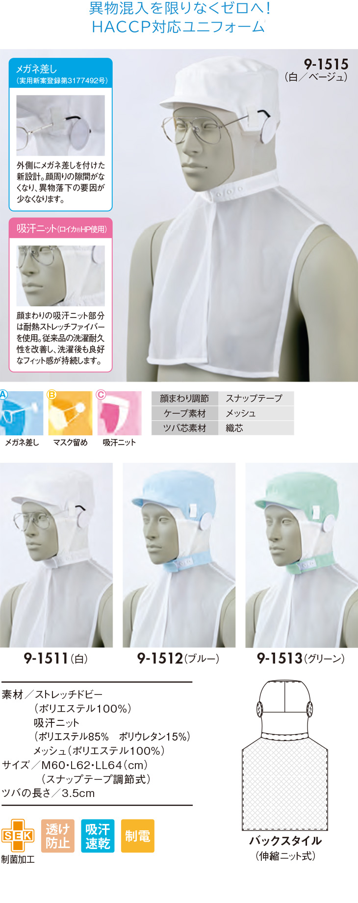 | メガネ差し、マスク留め、吸汗ニット、メッシュケープ、後部伸縮ニット式 |