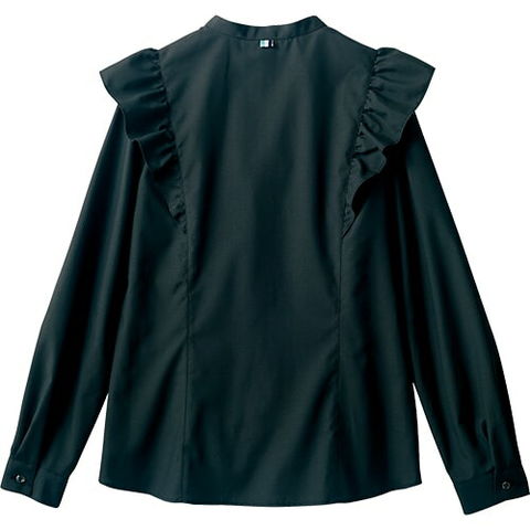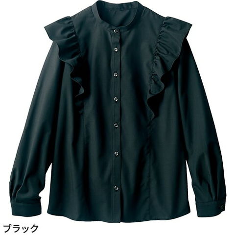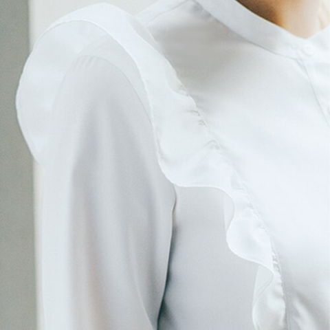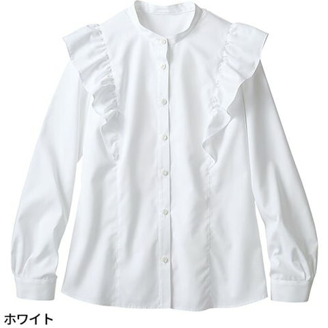 両肩から下に向けてフリルを配した、スタンドカラーのブラウス。