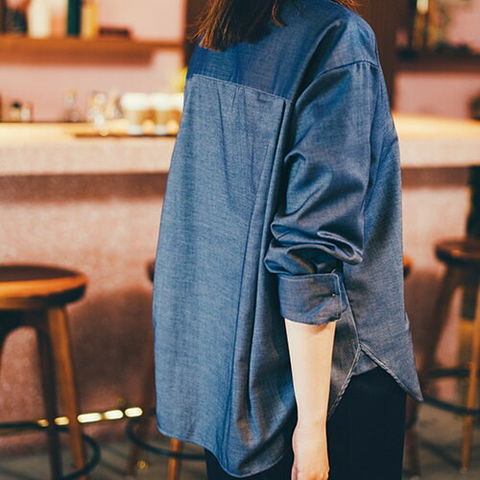 肩を落として着るワイドシャツは、ボタンを開けて羽織りでも、きちんと占めてもOK。