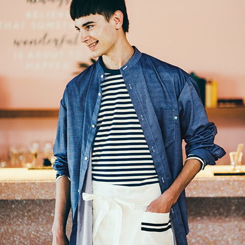 すっきりとした爽やかな印象で、着こなしの個性が光るカジュアルな装いは、コーヒースタンドやカフェ、ベーカリーと相性バツグン。