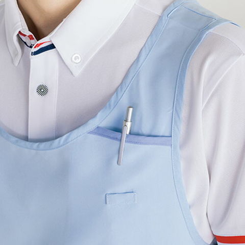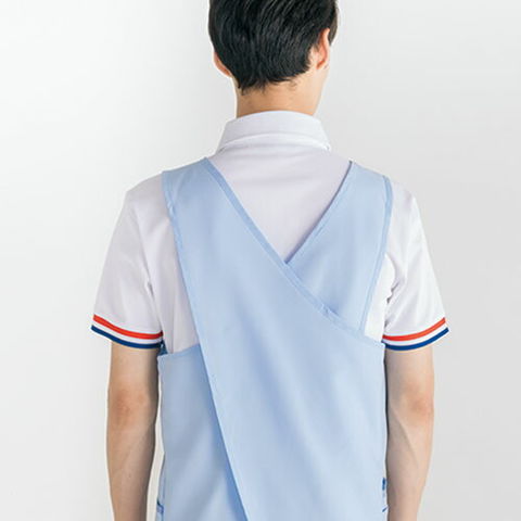 | 着脱が簡単な肩口スナップテープ仕様。かぶりタイプ。肩ひもがズレ落ちにくいデザイン。 作業の邪魔にならない位置にペン差し用ポケット付き。 胸元に名札ループ。 右脇ポケットにはタオルなどを掛けられる便利なループ付き。 |