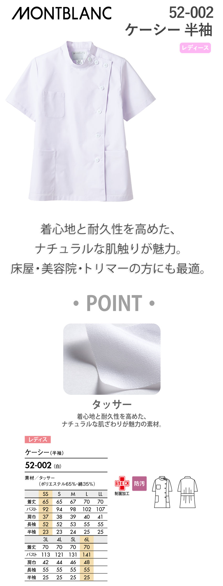 ケーシー 白衣 ジャケット 52-002 医療 襟なし 住商モンブラン レディース 女性用 半袖 医師 医者 女医 看護師 ナース トリマー 医療用 病院 美容院 作業療法 上衣 医務衣 診察衣 制菌 快適 ベルト 安い 可愛い かわいい おしゃれ