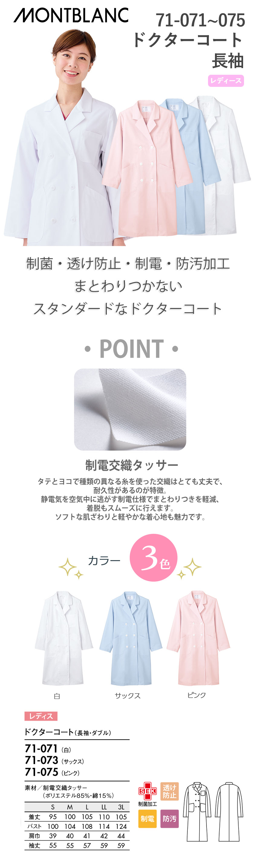 住商モンブラン ドクターコート 長袖 女性用 71-071・073・075 白衣 レディース ウィメンズ 医者 薬剤師 医療 制服 ユニフォーム 病院 エステ 軽量 薄手 透け防止 制電 名入れ おしゃれ かわいい 可愛い 人気 おすすめ
