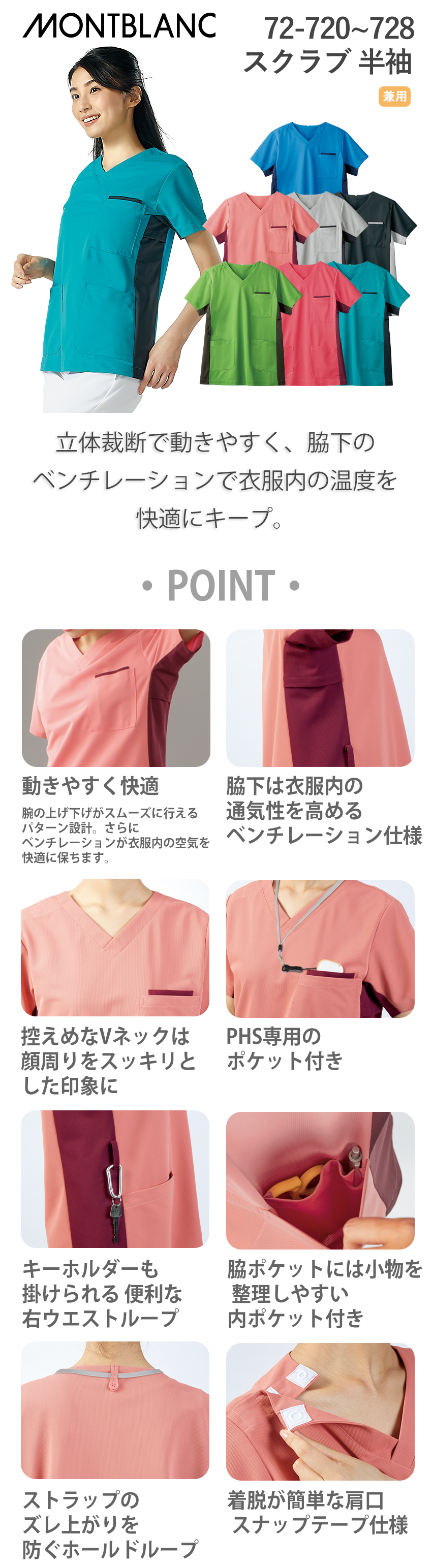 住商モンブランのスクラブ、制菌・透け防止・吸汗速乾・制電・防汚加工を付与、Vゾーンネック仕様の立体裁断で動きやすく、脇下のベンチレーションで衣服内の温度を快適にキープ。