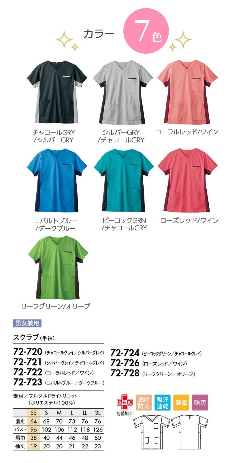 スクラブ 白衣 医療 住商モンブラン ユニセックス 男女兼用 半袖 72-722・723・721・720・724・728・726 医師 医者 看護師 ナース 研修医 医療用 人気 手術衣 薄手 動きやすい 速乾 Vネック 軽い 病院 小児科 かっこいい 可愛い かわいい おしゃれ