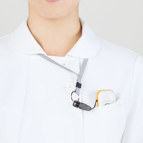 住商モンブランのメディカルジャケット、制菌・透け防止・吸汗速乾・制電・防汚加工を付与、ほど良い大きさの襟と縦並びの2つボタンが品よく印象的