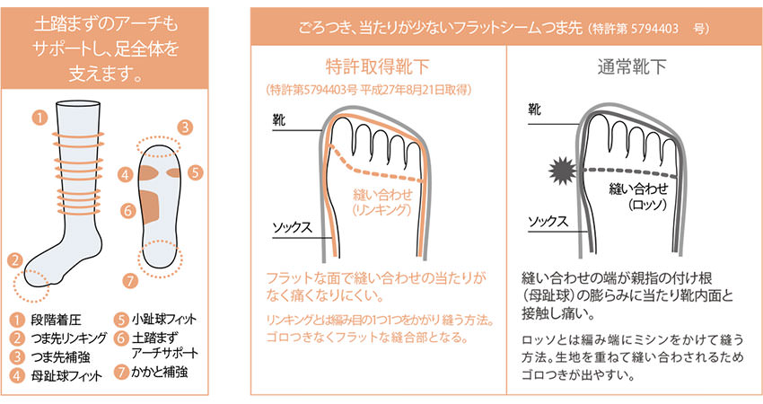 フラットシームなつま先:フラットな面で縫い合わせのあたり(親指の付け根)がゴロつかず痛くなりにくい。