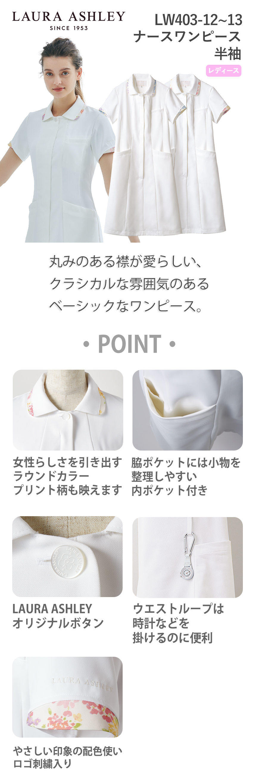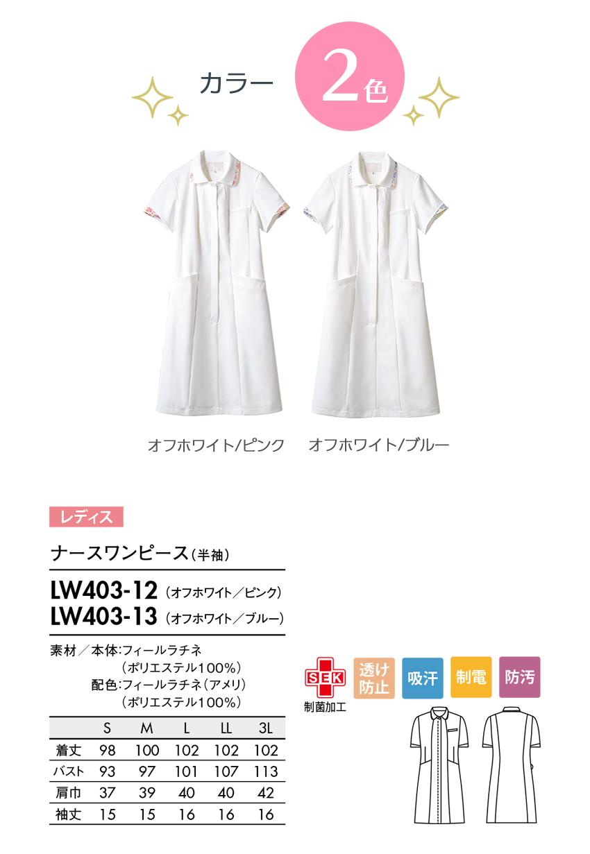 ナースワンピース 白衣 ナース服 LW403 住商モンブラン 半袖 レディース 女性用 医療用 看護師 ナース ナースウェア 病院 クリニック エステ サロン 事務 受付 人気 襟付き 花柄 おしゃれ かわいい 可愛い きれいめ