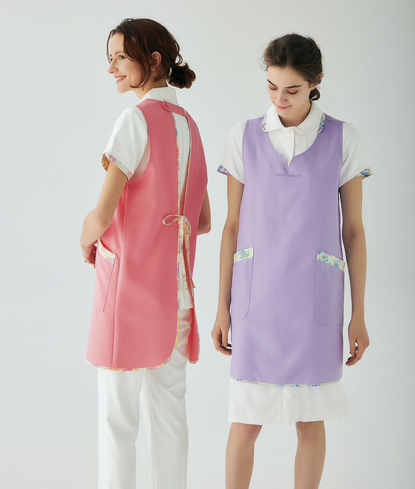 花のように鮮やかなカラーバリエーション。チュニックのように着こなせる、襟もとのスリットや花柄パイピングなど小技を効かせた心ときめくパステルカラーのエプロン。