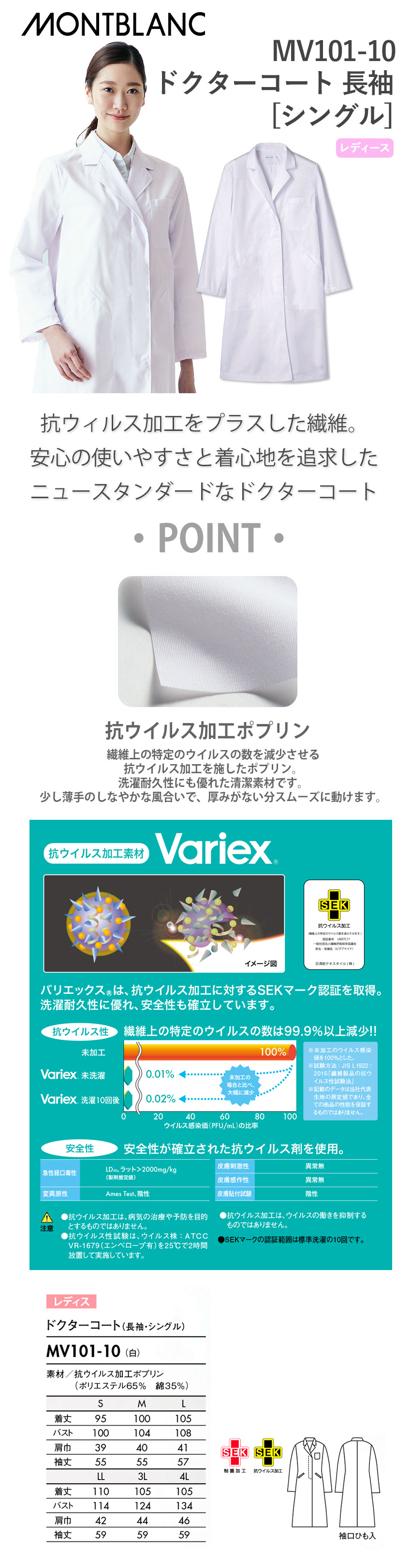 住商モンブラン ドクターコート 長袖 女性用 MV101-10 白衣 レディース 医師 薬剤師 看護師 ナース 医療 制服 ユニフォーム 病院 整骨院 薬局 抗ウイルス 清潔 丈夫 おしゃれ かわいい 可愛い 人気 おすすめ