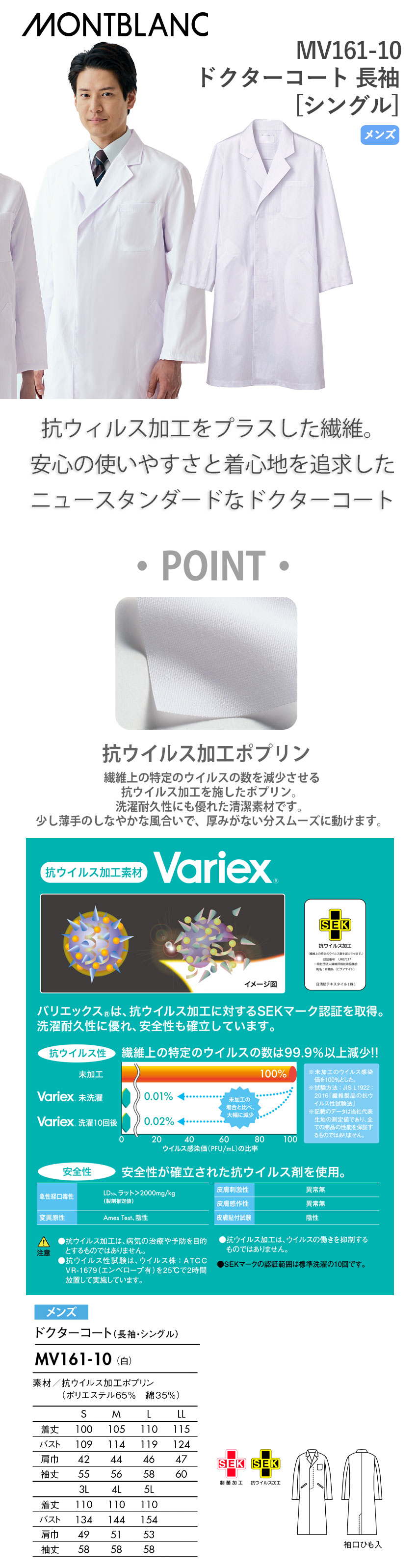住商モンブラン ドクターコート 長袖 男性用 MV161-10 白衣 メンズ 医師 薬剤師 看護師 ナース 医療 制服 ユニフォーム 病院 整骨院 薬局 薄手 抗ウイルス 制菌 おしゃれ かっこいい 人気 おすすめ 通販