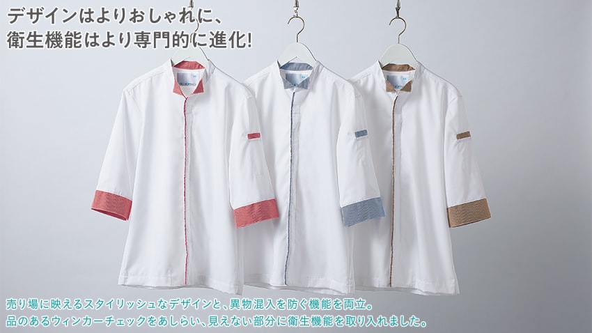デザインはよりおしゃれに、衛生機能はより専門的に進化した白/ブルーチェックの調理コート。