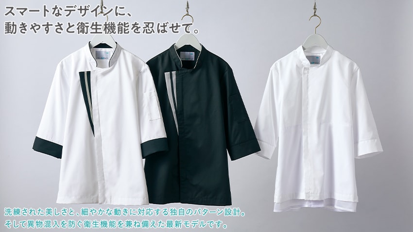 七分袖の男女兼用コックコート。体毛の落下を防止する袖口ネット付き。左袖にペン差しポケット。動きやすさをサポートする背面プリーツ。破損しにくいスナップ・ファスナーで破損による異物落下を防止。襟裏に濃色を配色することで襟裏汚れの目立ちをカバー。