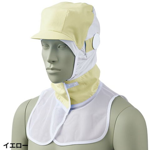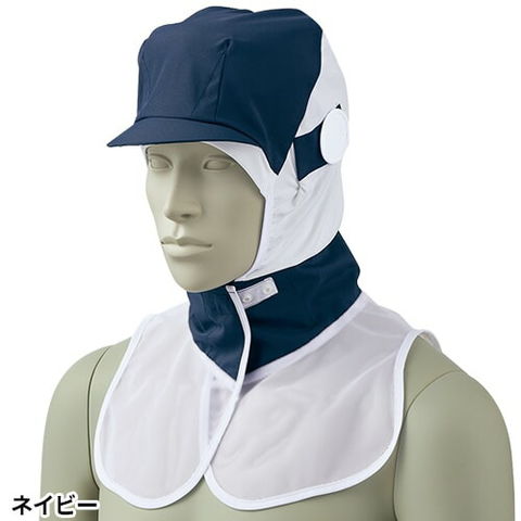 ケープ付きタイプ調節式の頭巾帽子(衛生キャップ)。後頭部と顔まわりに伸縮性のあるニット素材を使用。かぶり心地が良くタレ(毛髪落下防止ネット)を中に入れても突っ張らず長い髪もきれいに収まります。ツバ芯には形態安定性に優れたシリコン素材を採用することで型崩れを防止。メガネ差し、マスク留め、吸汗ニット付き。