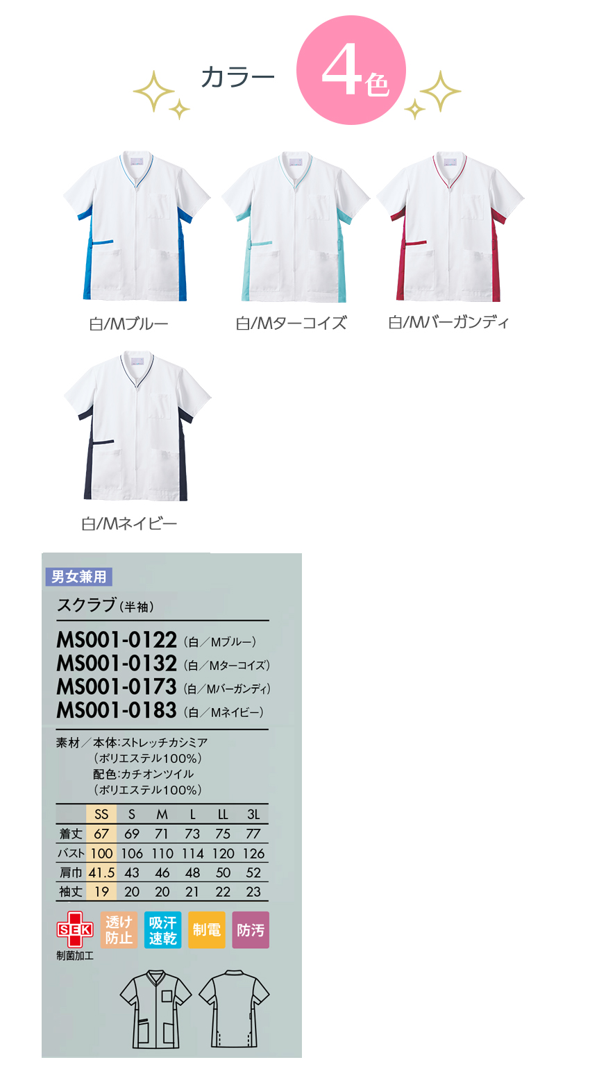 スクラブ 白衣 医療 看護師 ナース ユニセックス 住商モンブラン 半袖(男女兼用) MS001 医者 研修医 人気 ファスナー 前開き 衿付き 制菌 速乾 制電 病院 小児科 薬剤師 介護 安い かっこいい 可愛い かわいい おしゃれ 動きやすい おすすめ