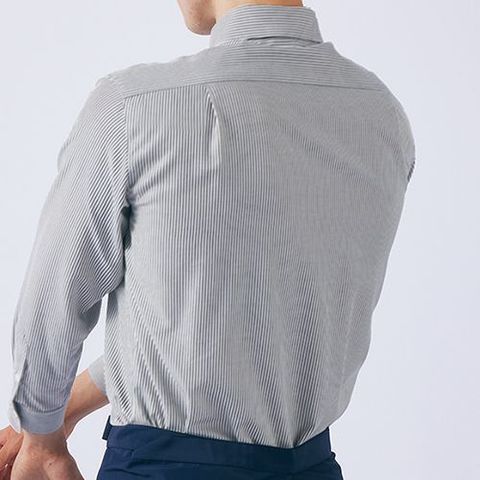 美しい立ち姿と動きやすさを両立させた長袖のストライプシャツ。袖下のマチやバックスタイルのタック位置の工夫により動きやすい機能設計です。