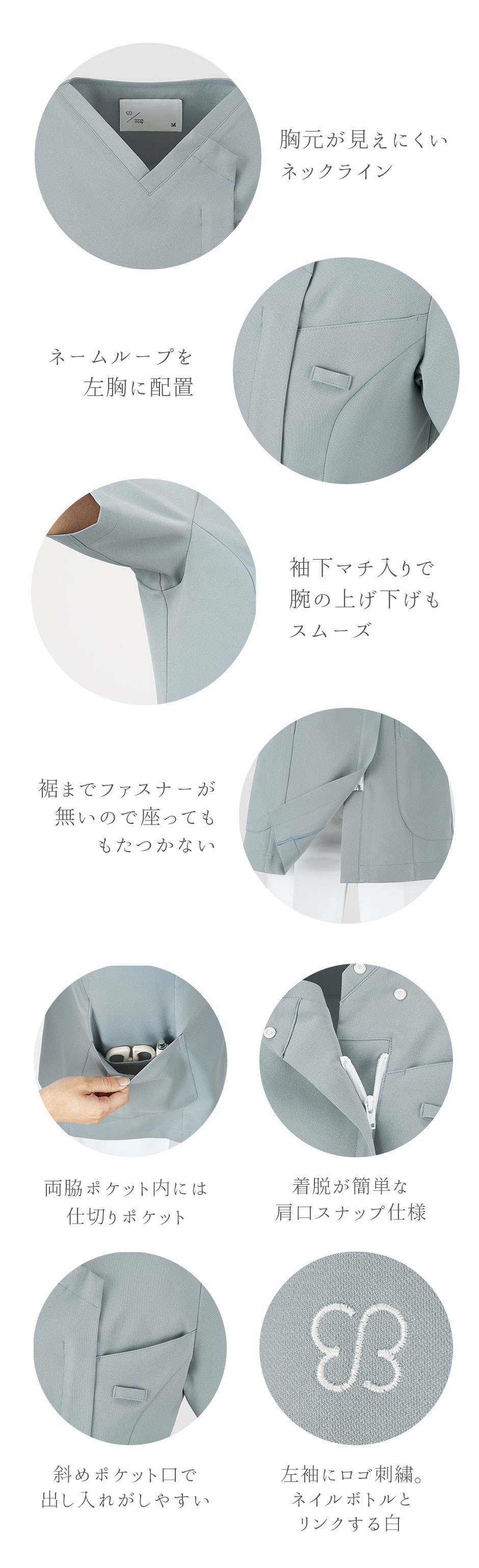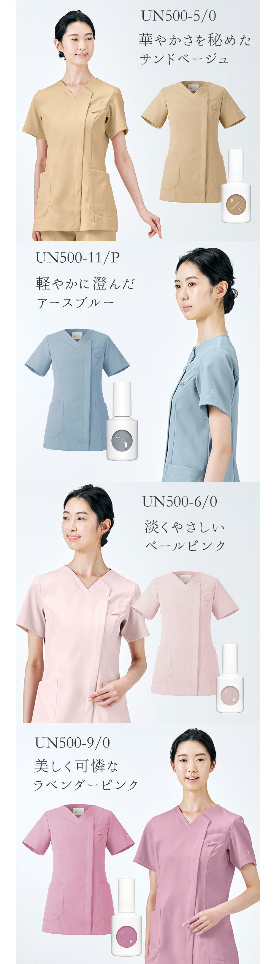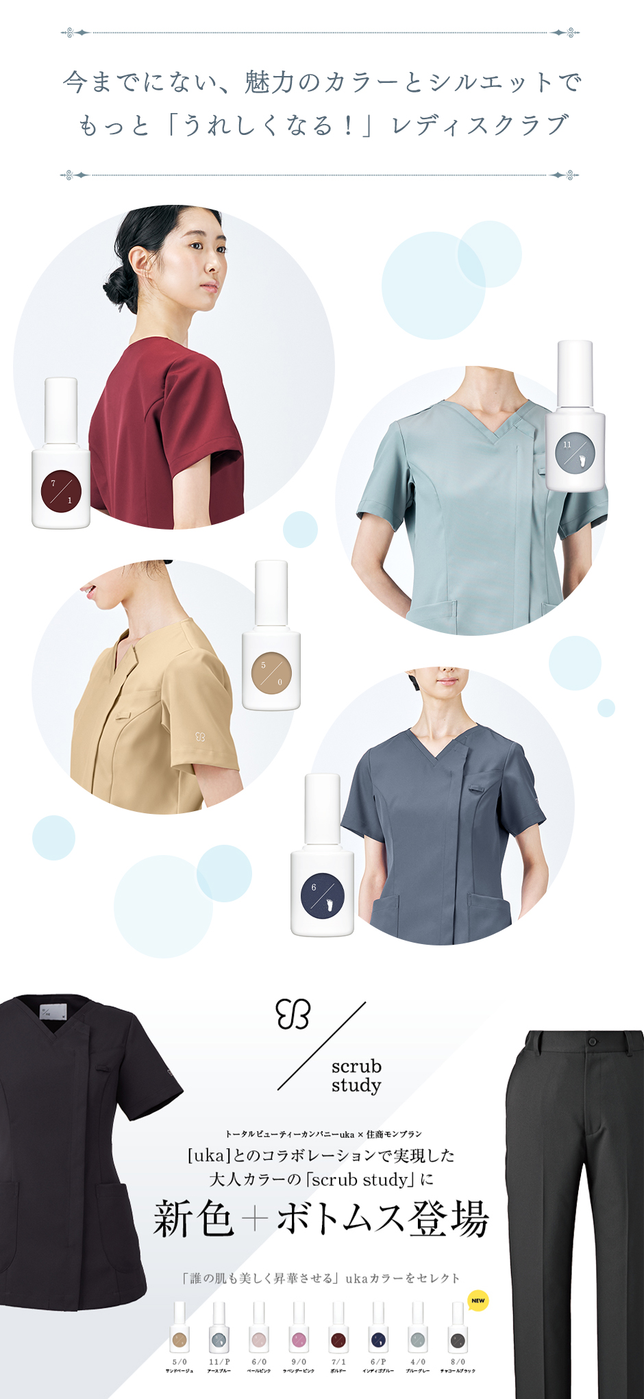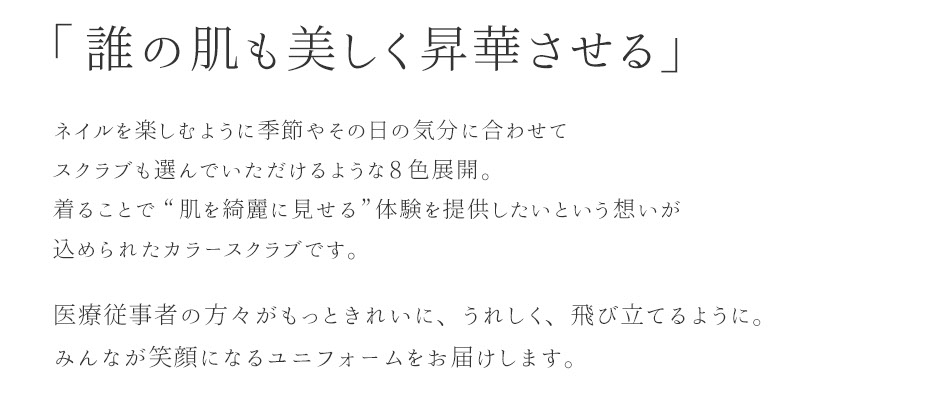 | 「誰の肌も美しく昇華させる」というukaのネイルカラーに着想を得たカラーバリエーション。ネイルを楽しむように季節やその日の気分に合わせてスクラブも選んでいただけるような8色展開。着ることで”肌を綺麗に見せる”体験を提供したいという想いが込められたカラースクラブです。また、住商モンブランがこれまでに積み重ねてきたパターン研究をもとに色とともにより美しくスタイルアップできるシルエットを実現。着心地や動きやすさにも配慮した一着です。左袖にはネイルボトルとリンクする白色ukaロゴの刺繍があしらわれています。 |