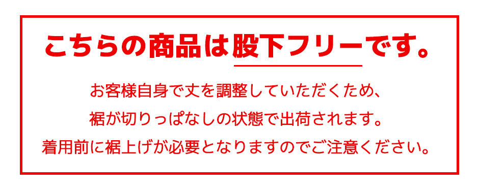 | こちらは股下フリー商品です。 裾が切りっぱなしの状態です。裾上げが必要となりますのでご注意ください。 |
