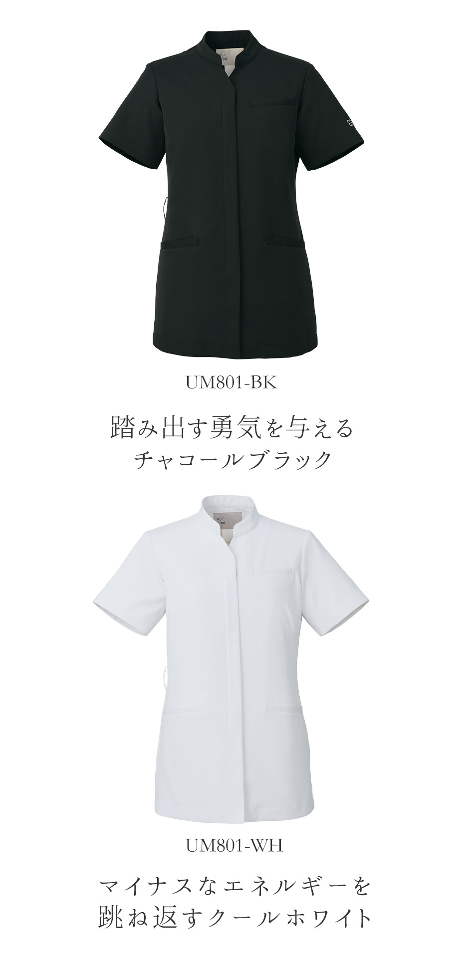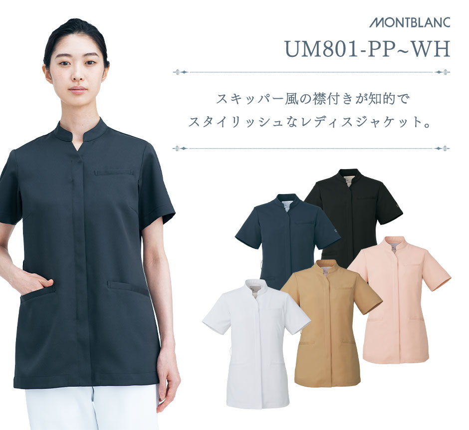 ケーシー 白衣 ジャケット レディース 女性用 住商モンブラン uka ジャケット レディス 半袖 UM801-BK、UM801-IB、UM801-PP、UM801-SB、UM801-WH 医療 制服 ユニフォーム 医者 医師 看護師 ナース 病院 横掛 おしゃれ かわいい 可愛い 動きやすい