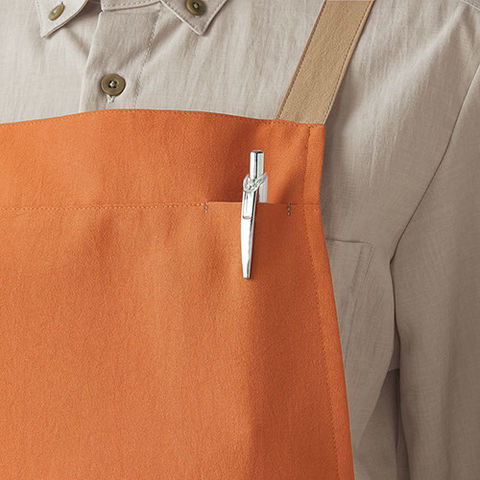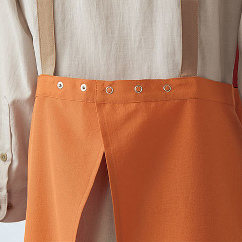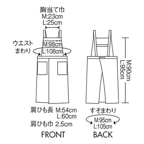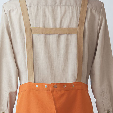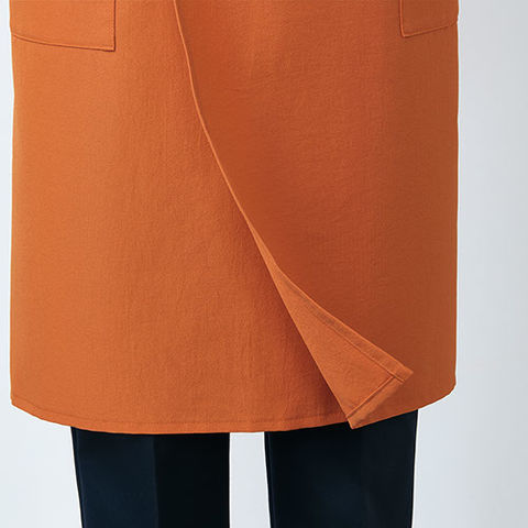 | ■ヒップまでカバーしながら足さばきの良い重ねスリット。 ■ウエストはドットボタン調節で後ろ姿もスッキリ。 ■胸もとにペンさしポケット付き。 ■動いても肩ひもがずれにくいH型。 |