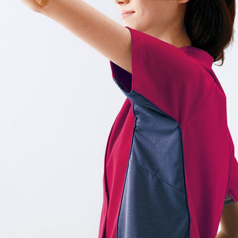 | 本体:ハイパーストレッチトリコット(ポリエステル100%) 配色:デュアルファイン(R)ニット(ポリエステル100%) ハイパーストレッチトリコット(ポリエステル100%) 当社従来品のトリコットに比べ約3倍のストレッチ性(ヨコ方向)を発揮し、制電機能も備えたワープニット。なめらかな風合いと軽い着心地もポイント。 デュアルファイン(R)ニット(ポリエステル100%) ストレッチが効いて動きやすく汗染みが目立ちにくい機能素材。 |