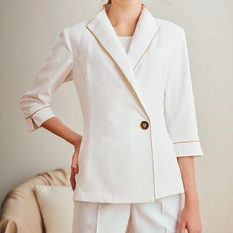 | ネームプレートループ、外ポケット3個、両脇・袖先スリット、高級感のある色味のボタンとパイピング |