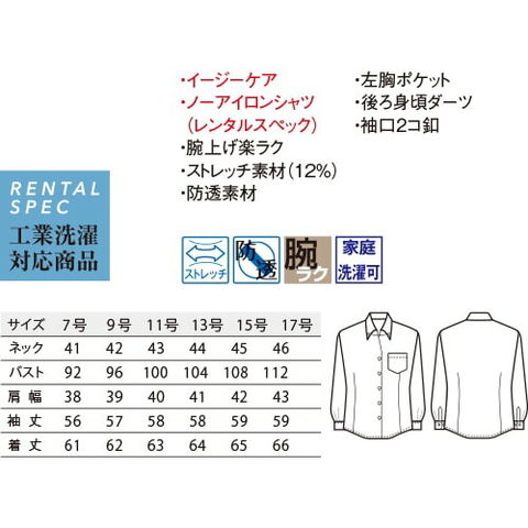 イージーケア、ノーアイロンシャツ(レンタルスペック)、腕上げ楽ラク、ストレッチ素材(12%)、防透