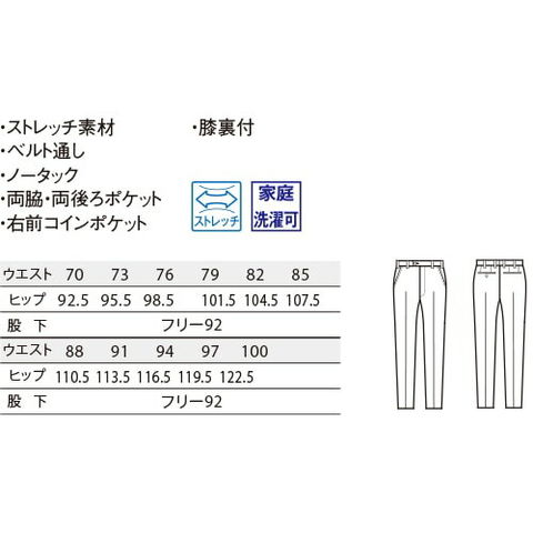 | ベルト通し、ノータック、両脇・両後ろポケット、右前コインポケット、膝裏付 |