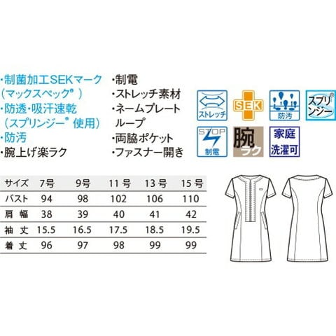 制菌加工SEKマーク(マックスペック)、防透・吸汗速乾(スプリンジー使用)、防汚、腕上げ楽ラク、制電、ストレッチ
