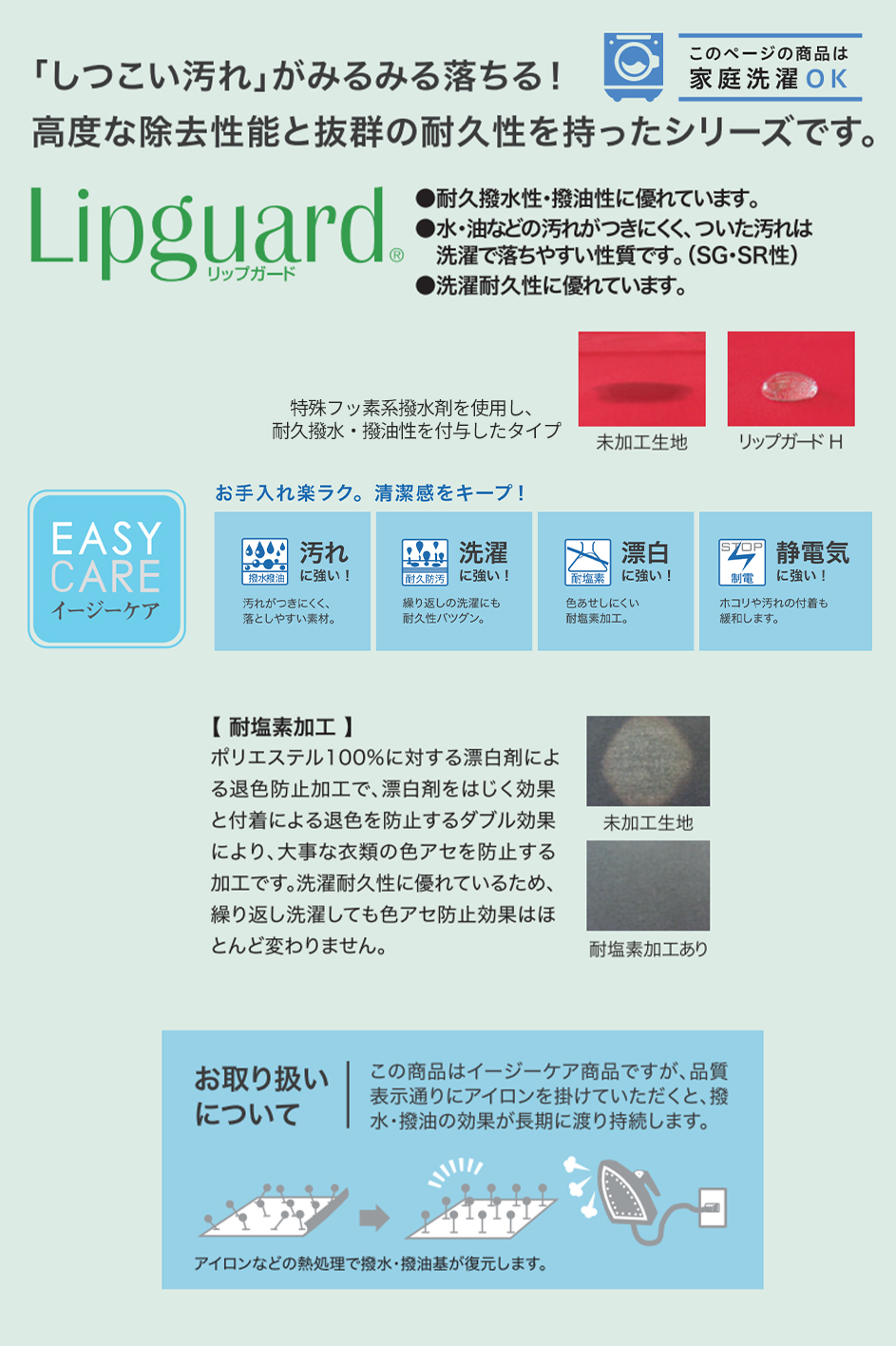 | イージーケア、耐塩素、撥水・撥油・耐久防汚(リップガード)、制電 |