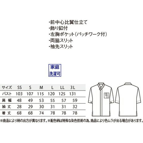 | 前中心比翼仕立て、飾り釦付、左胸ポケット(パッチワーク付)、両脇スリット、袖先スリット、商品により柄の出方が異なります。配色柄は特殊な染色技術のため商品により色ムラが出る場合があります |