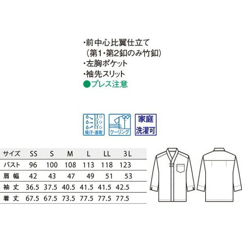 | 前中心比翼仕立て(第1・第2釦のみ竹釦)、左胸ポケット、袖先スリット |