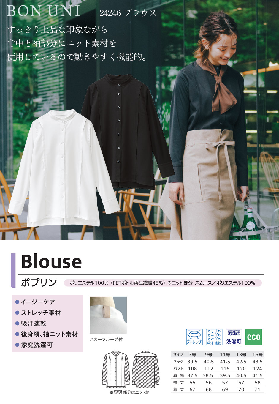 ストレッチ、吸汗速乾機能がついて家庭洗濯にも対応したイージーケア商品です。