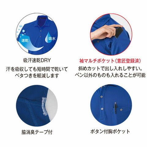 | 樹脂穴ボタン、吸汗速乾DRY、脇消臭テープ付、袖マルチポケット、ボタン付胸ポケット、動きやすいらぐらん袖 |