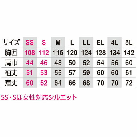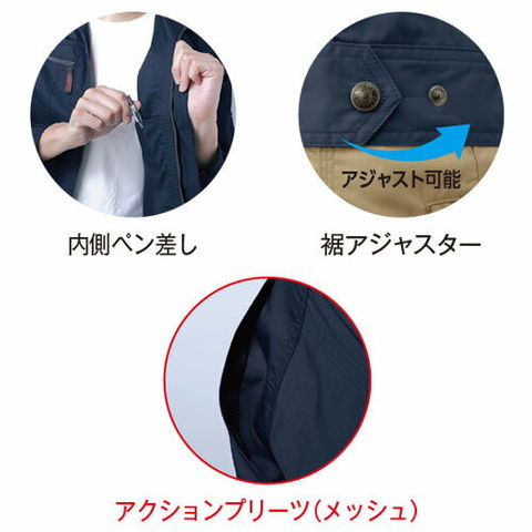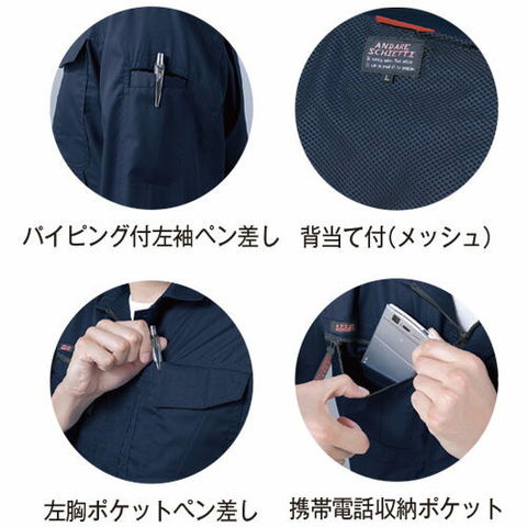 | 左胸ポケット(巾14cm×深さ17cm)、右胸ポケット(巾13cm×深さ15cm)、背当て(メッシュ)、携帯電話収納ポケット、裾アジャスター、アクションプリーツ、パイピング付左袖ペン差し、左胸ポケット(ペン差し)、内側ペン差し |